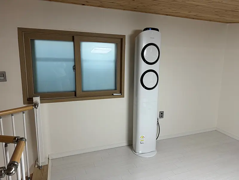 디자인은 정말 세련되고 현대적이에요. 실내기는 길쭉한 원통형으로 되어 있어서 공간을 많이 차지하지 않아요. 제가 설치한 방은 작은 편인데도 불구하고, 공간 활용이 정말 좋더라고요.